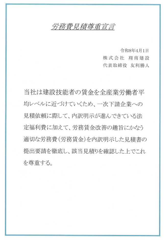 「労務費見積尊重宣言」とは日建連として専門工事会社が行う技能に見合った給与の引き上げに必要な労務費(労務賃金)を確実に支払うことで元請として共同でこの好循環を促進していくためのものです。